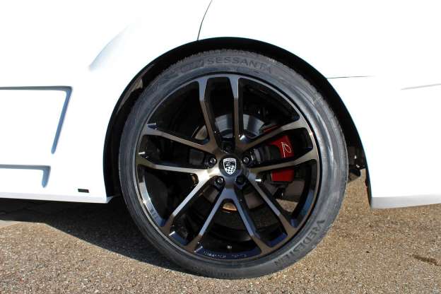 車尾部分,首先是增配車頂擾流尾翼,而新設計的後保桿,除了兩側梯形散熱口,並於中央設有擾流翼,搭配上獨特的中置三出、口徑為100mm之排氣管,別具自我風格;最後再蹬上305/35 R22 大尺碼胎圈組,強化氣勢。